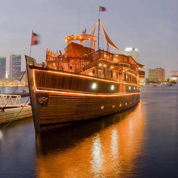 Boarding a traditional Arabian dhow, a wooden boat with a distinctive design that reflects the region's maritime heritage, you'll set sail on a leisurely cruise along the historic Dubai Creek. The dhow's elegant setting, adorned with traditional decor and ambient lighting, creates a charming and inviting atmosphere for your dining experience.