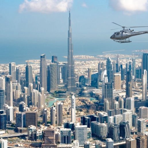 Get an aerial view of iconic Dubai attractions like Burj Al Arab, Burj Khalifa, The Palm & World Islands