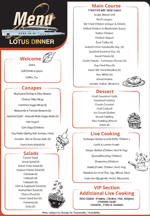 Gourmet Buffet: Savor an exquisite gourmet buffet featuring a tantalizing selection of international and Arabic delicacies, all crafted with the finest ingredients.