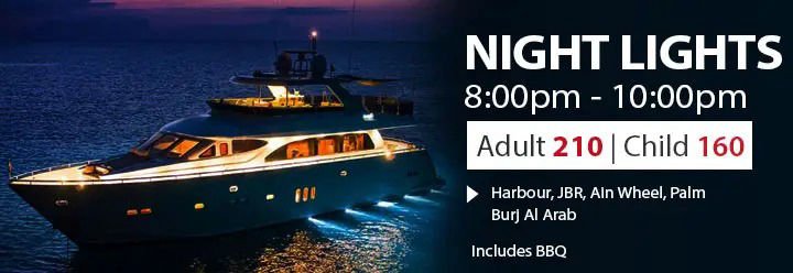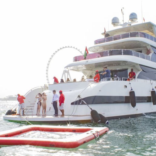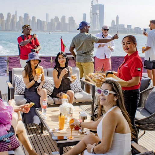 The yacht has a dining area, six beautiful cabins and a sunny top deck, where the DJ keeps the party vibes going. Dance as you cruise past the Ain Wheel, or chill out on the lower deck. The sunbed and seating area is ideal for sunbathing, sunset views, and all those essential selfie moments.
