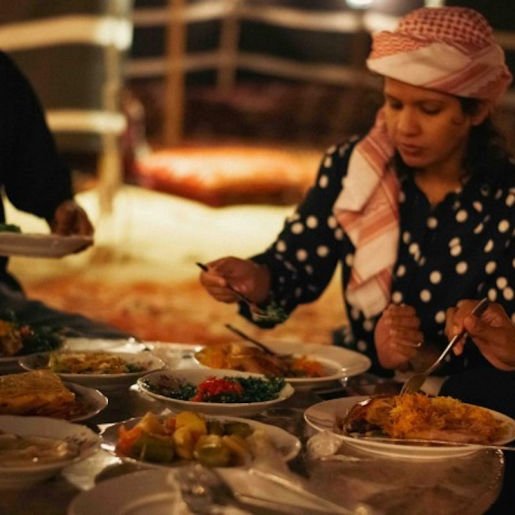 At the Bedouin Village, climb aboard your hump-backed friend for a camel ride. You'll get to observe a live Arabic coffee-making session and sample the aromatic coffee, too, before witnessing the stunning desert sunset and savoring a traditional Emirati 6-course meal.