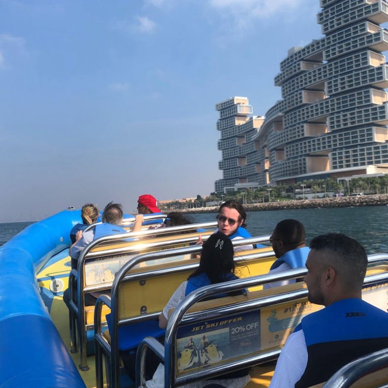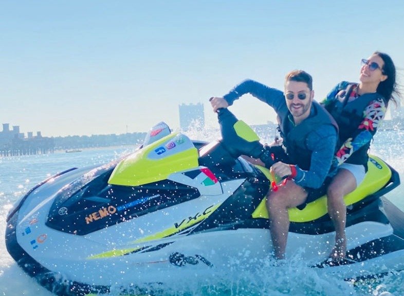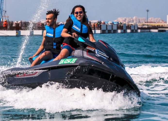 1. **Jet Skiing:** Zoom across the azure waters of the Arabian Gulf on a high-speed jet ski. Rent a jet ski and explore Dubai's iconic landmarks, such as the Burj Al Arab, Palm Jumeirah, and Atlantis, The Palm, while enjoying the thrill of the ride.