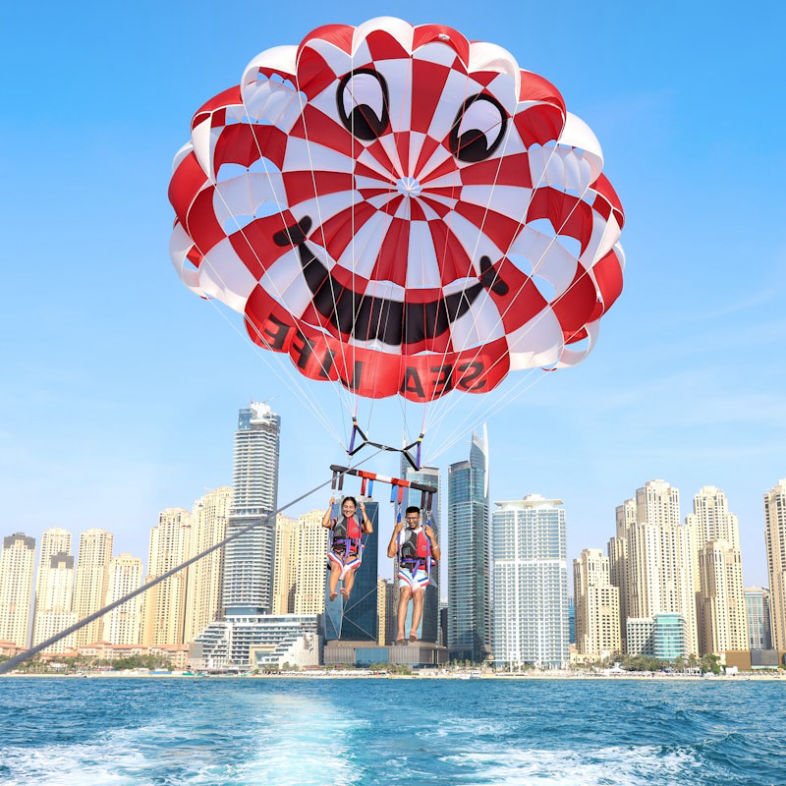 5. **Parasailing:** Get a bird's-eye view of Dubai's skyline and coastline with a parasailing adventure. Strap into a harness and soar high above the water, towed by a speedboat, as you take in panoramic views of the city and the Arabian Gulf below.